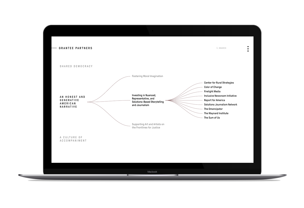 The Hearthland Foundation is a passion project founded by Steven Spielberg and Kate Capshaw. The organization makes grants to nonprofits, co-designs projects, and invests creative capital to help build a more just, equitable, and connected America. They tasked us with designing and building their website, which served as a tool to publicly launch the organization. I was responsible for collaborating with our creative team and the Spielberg’s creative masterminds to develop elements of the website, including creating modules and animation concepts for the homepage, an interactive grants archive, image gallery and form submission tool.